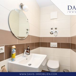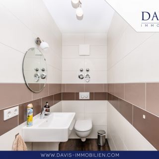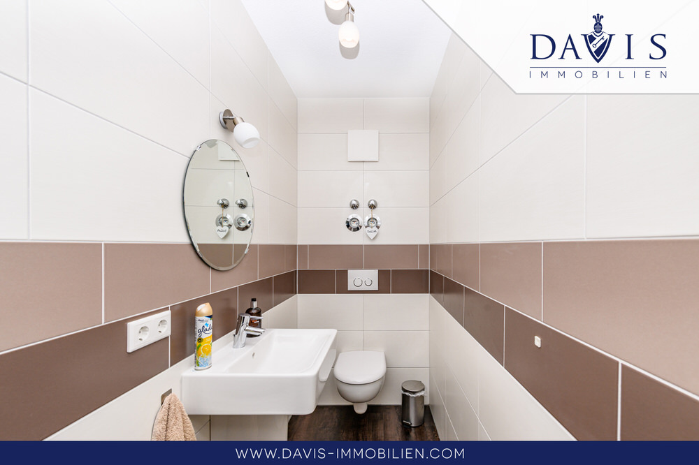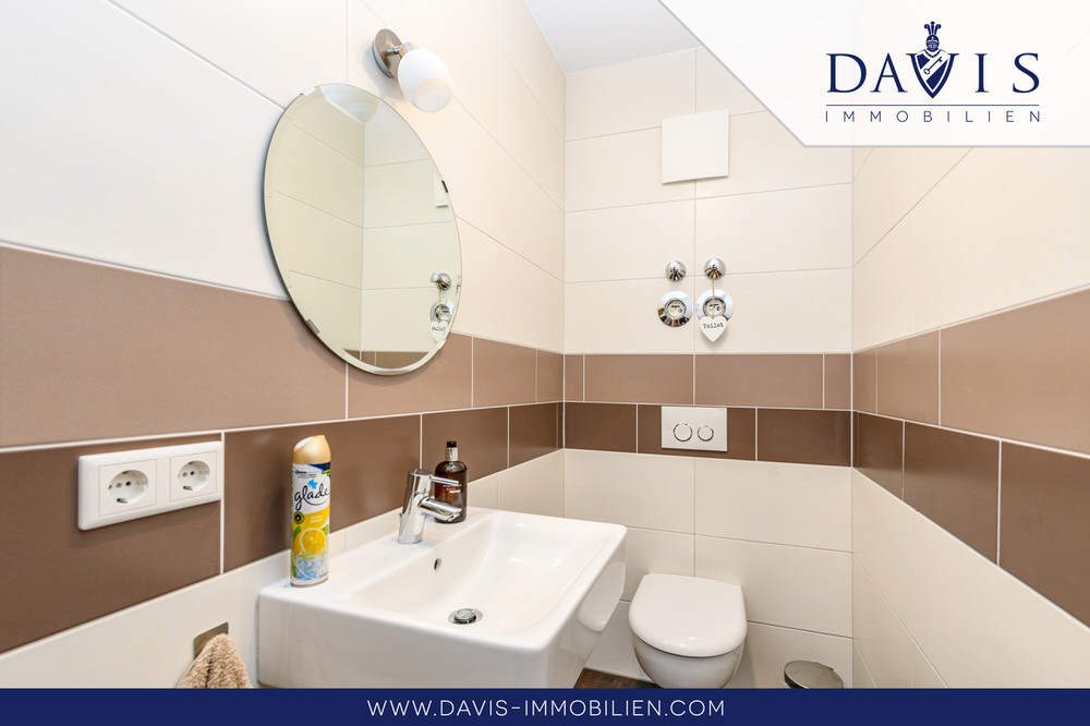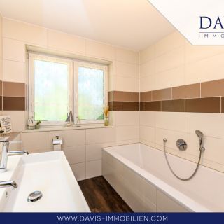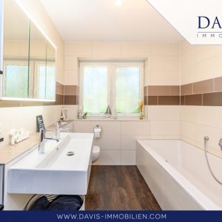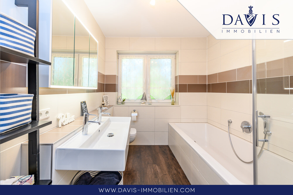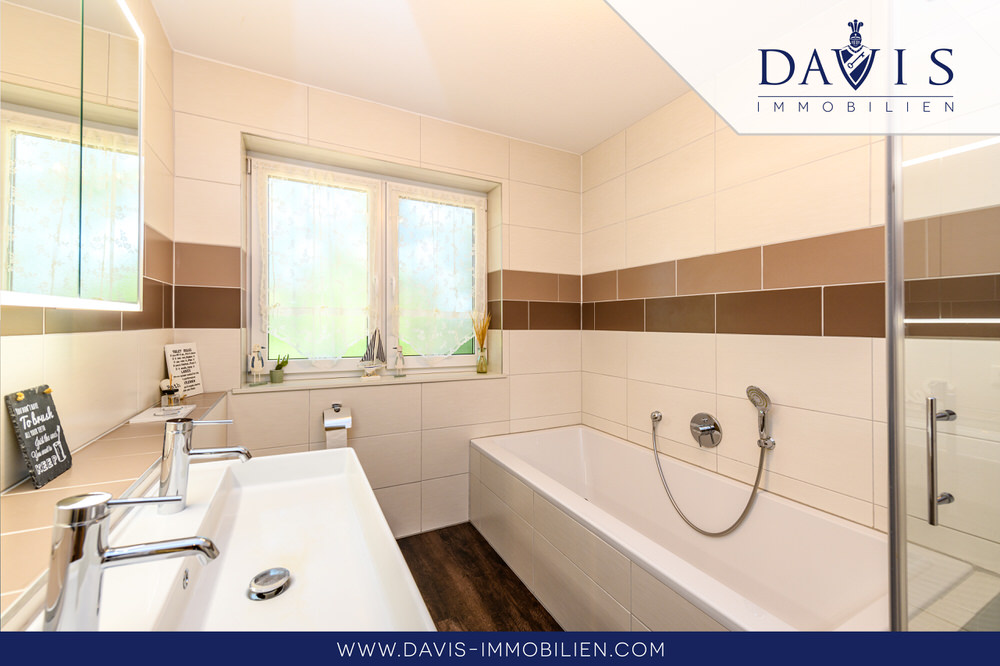 Mit einem Auge fürs Detail wurde ein geräumiges Badezimmer mit einer Badewanne und Dusche warm eingerichtet. Ein Doppelwaschbecken hebt den Komfort des ohnehin modernen Badezimmers noch einmal besonders. Das separate WC erweist sich im Alltag als sehr Praktisch und ist auch sinnvoll platziert.