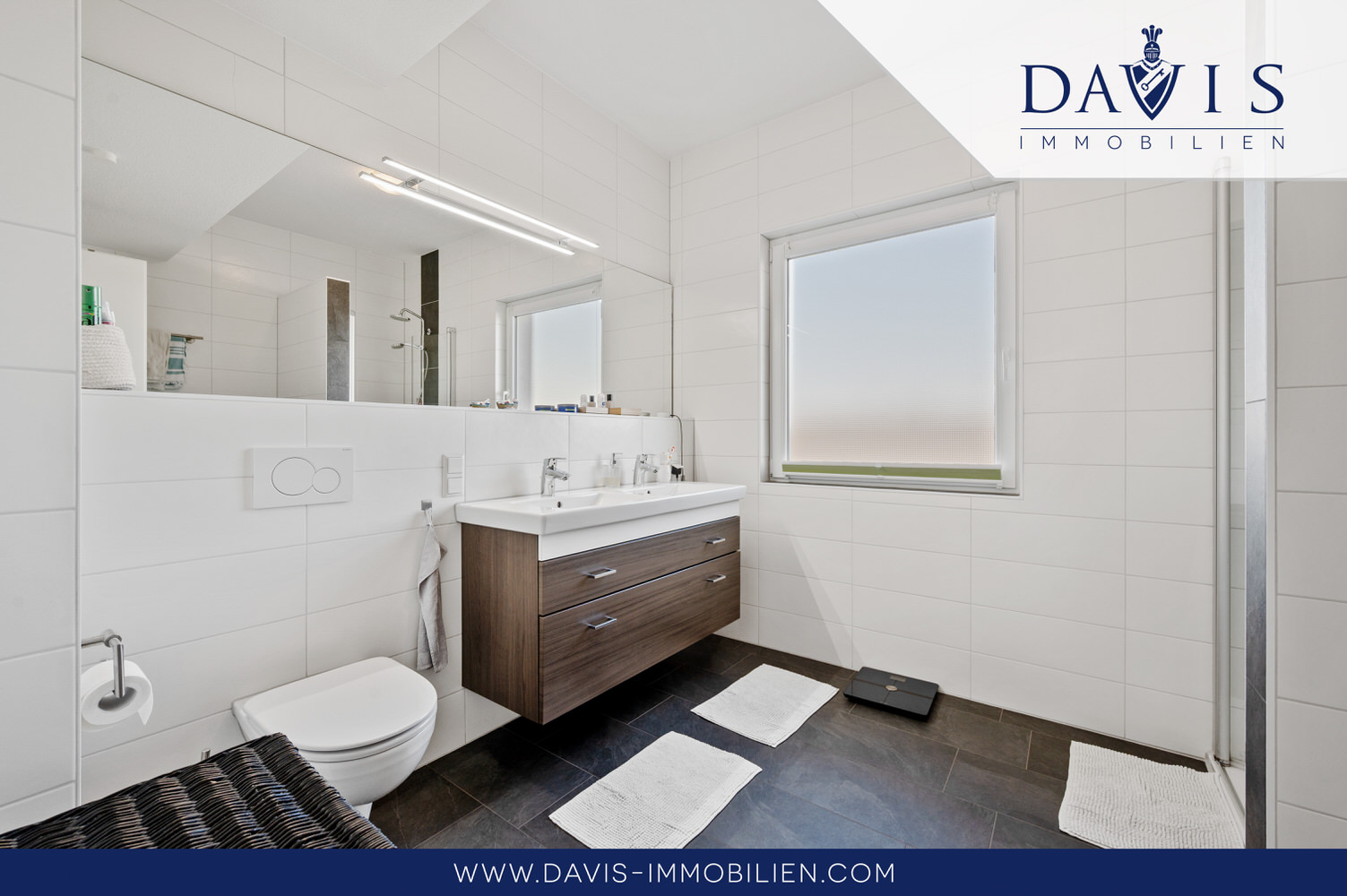 Zwei vollwertige Bäder machen den Morgen entspannt: Im 1. Obergeschoss erwartet Sie ein Wellnessbad mit Badewanne, Dusche und Tageslicht, während im 2. Obergeschoss eine stilvolle Dusche mit Fenster für Frische sorgt. Ein großzügiges Gäste-WC im Erdgeschoss rundet das Angebot ab.